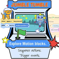 Students build Jumble Tumble. In this game a press of a key creates a mish mash of characters dashing and rolling across the screen. This chaotic scene uses Motion blocks to control movement. By sequencing the coding blocks, students discover how to direct and loop action. For an extra challenge, they can use if-then logic to create a silly outcome when two sprites crash.
