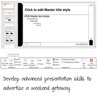 Extension activities offer additional skills. Learn how to add WordArt, insert video, design an interactive street map, animate slide objects, calculate travel costs, and compare costs online. - Build Stem and CTE Skills
