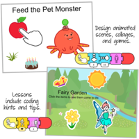The programming whiz kids design a game. They build code that has a player feed a pet monster. To start, they create an opening sequence to attract attention. It has the character talk, grow, shrink, and blink. The action is controlled using the Wait and Repeat blocks. Afterwards, students apply their knowledge to add food to the stage that when clicked moves to the pet monster and then disappears. What does the pet monster like to eat?